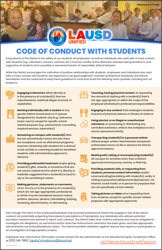 For inquiries or complaints related to employee-to-employee, student-to-employee, or work/employment-related discrimination, harassment, abusive conduct or intimidation, contact your school administrator or: